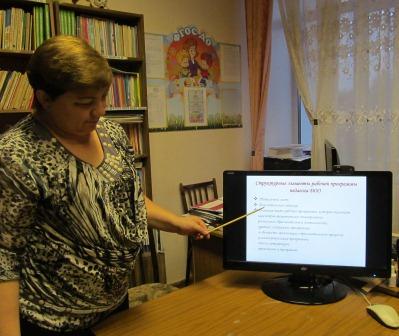 Подробно Н.В.Щелканова остановилась на примерных структурных элементах рабочей программы педагога и какая информация должна быть включена в каждый элемент. Применение слайдов позволило педагогам получить данную информацию наглядно и более доступно.